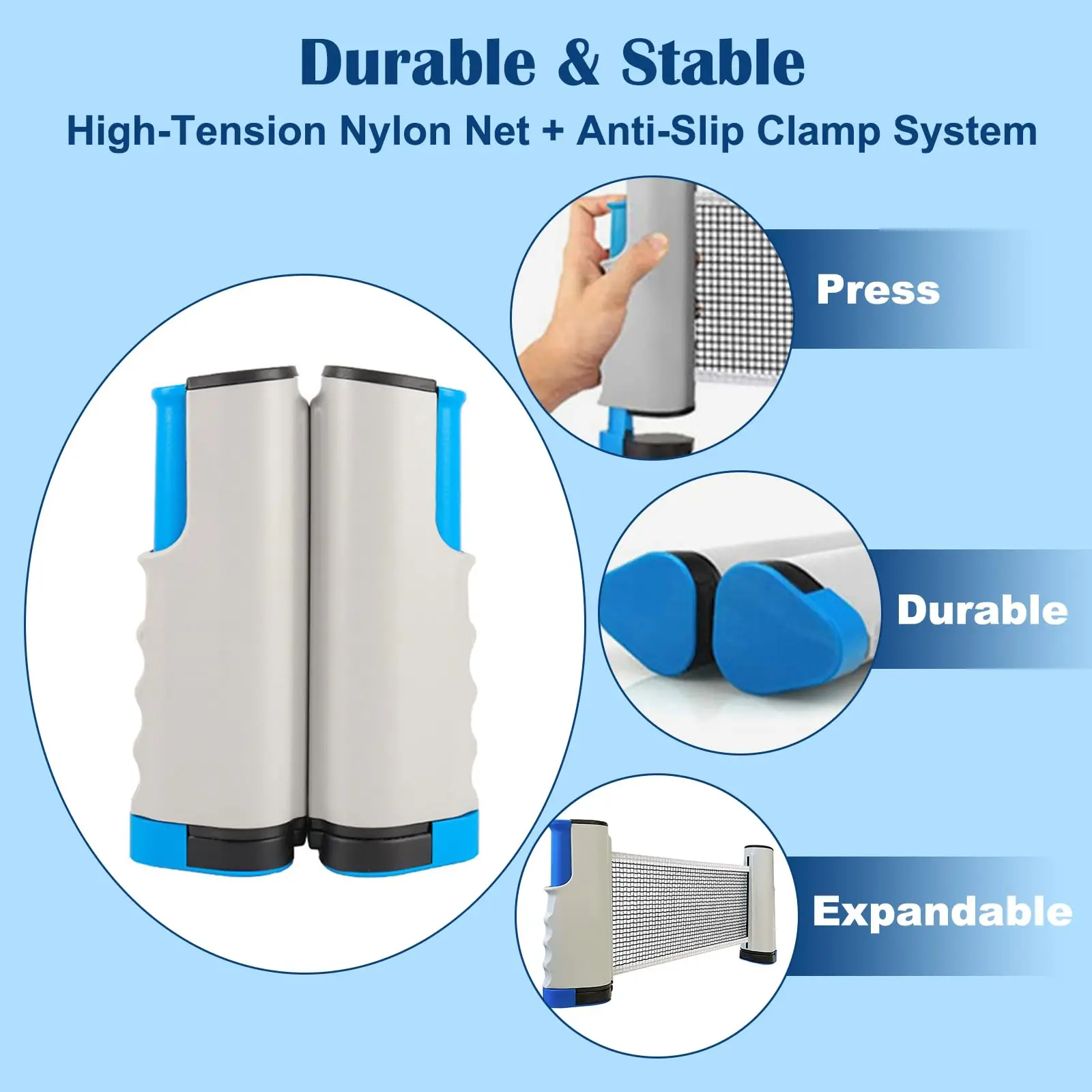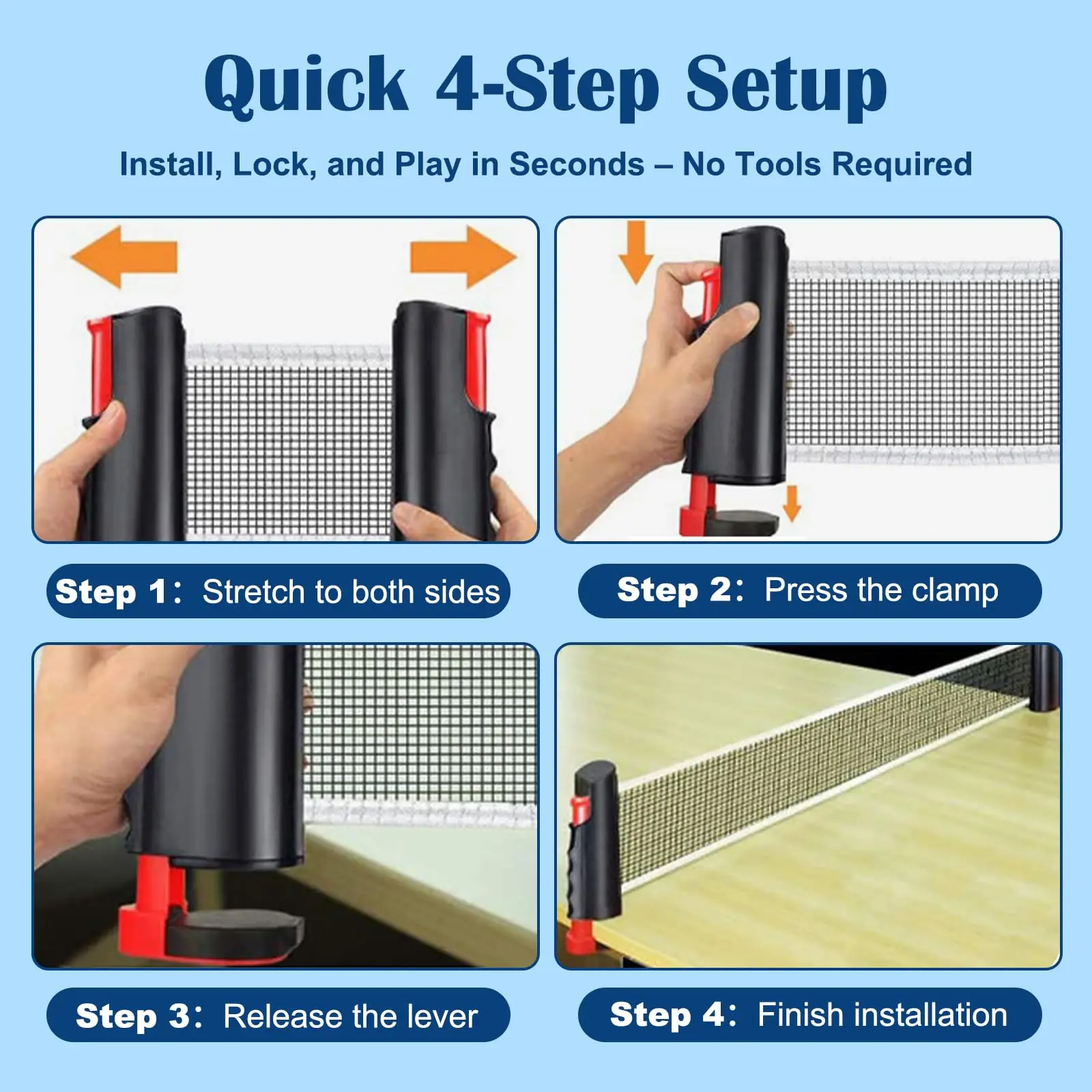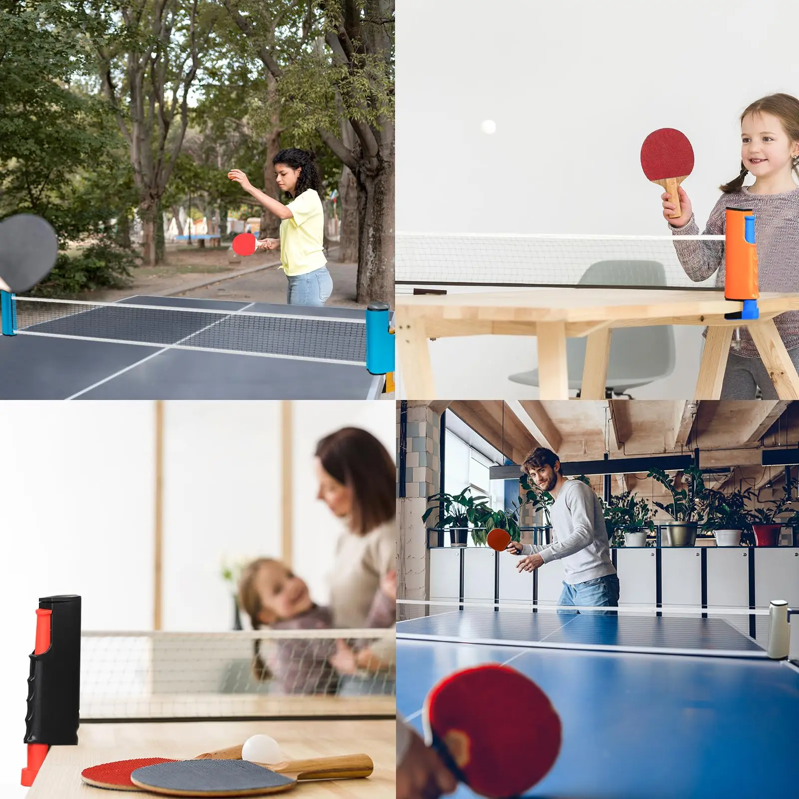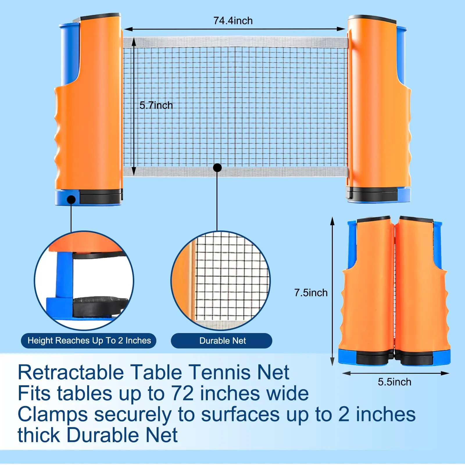 Flexible Table Fit — Retractable net expands up to 72" wide and fits tables up to 2" thick, easily adapting to dining tables, desks, and outdoor picnic tables